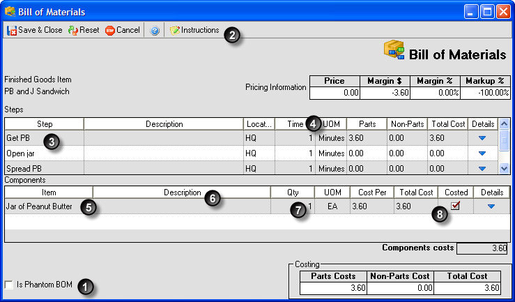Instructions button. This is used to add any special instructions about the BOM. You can instruct All Orders to copy the instructions into the Item comments on the work order in Work Order Preferences.