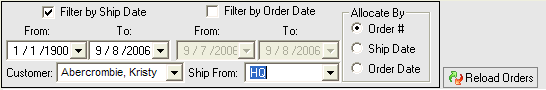 By default the open sales orders which are due to ship will be loaded. You have the ability change the load criteria using the filters based. You can filter based on Ship Date, Order Date, Customer, and Location. By default the list of orders are sorted by (and also allocated by) the Order #.