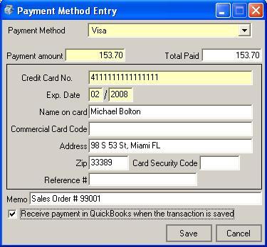 Just enter the payment details, including the method and amount. For credit card payments, you'll be prompted for the card details. check Receive Payment in QuickBooks to record the cash receipt in QuickBooks when saving the sales order.