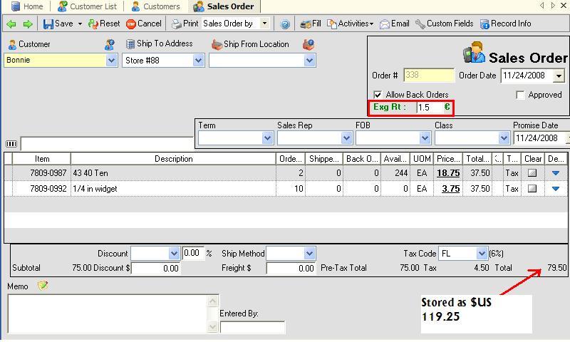 Now when you create a transaction with a foreign customer or vendor (PO, SO, Ship Doc, Receiving Doc) your prices and costs will be in their currency! In the database however, prices and costs will be stored in your home currency. In other words the screen and your forms that you send to the customer or vendor will be in their currency but the internal reports (e.g. open sales orders, ship doc log etc) will be in your currency.