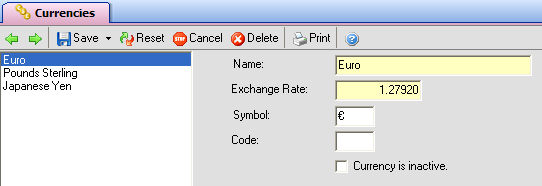You can add as many currencies as you wish by choosing Save & New from the Currencies tab's Save button. Give the currency a name as well as provide its symbol. For your convenience, here are the ALT codes of a few of the more common currency symbols: