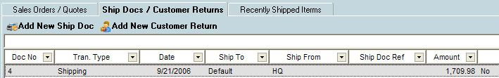 Ship Docs / Customer Returns. This tabs shows all Ship Doc and Return transactions for the Customer. Additionally, it offers buttons to create a brand new Ship Doc or Customer Return for the Customer in question.