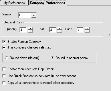 The Company Preferences tab offers choices that pertain to the program's general functionality: