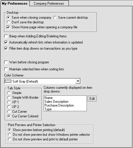 The General category of preferences contain miscellaneous options that affect the aesthetics and usability of the program (as seen as on the My Preferences tab), and also some basic functionality (viewable on the Company Preferences tab). Let us look at these tabs in turn:
