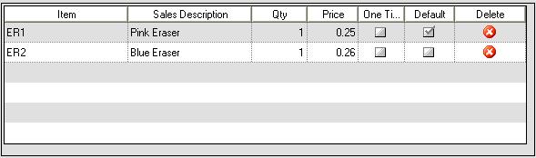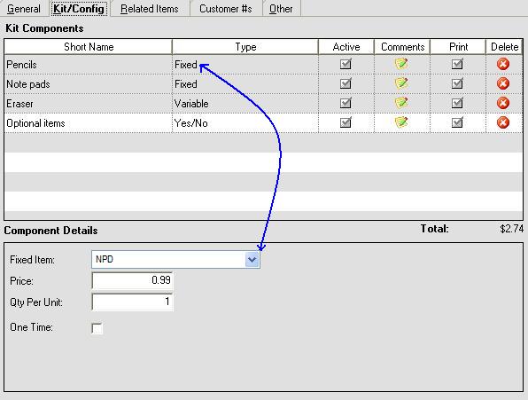 On the kit selections you will notice a check box called 'One time'. Generally when used on a sales order the quantity of the kit selections is multiplied by the quantity ordered for the entire kit. You may want however to include an item that does not vary with the kit quantity, to accomplish this check the 'One Time' and the selection quantity will NOT vary in proportion with kit quantity but rather stay fixed.