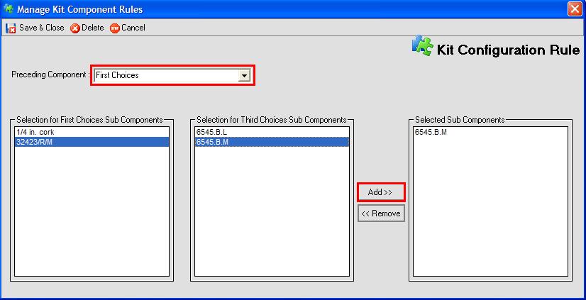 Using the drop down called Preceding Components, I select the component name that I want to base my rule on which will load its selection in the box 'Selection for First Choices..' and the current components selections are lists in the box 'Selection for Third Choices...'. I want to restrict my Third Choice component to 6545.B.M when 32423/R/M is selected in first choice. To this, I highlight both selections then click the add button. This will add 6545.B.M to the last box. Repeat until you have applied your rules then press Save & Close to return back to the item and press Save again commit the rules to the database.