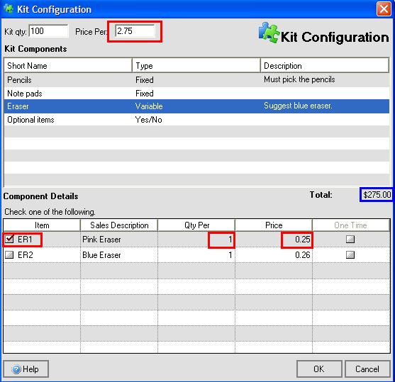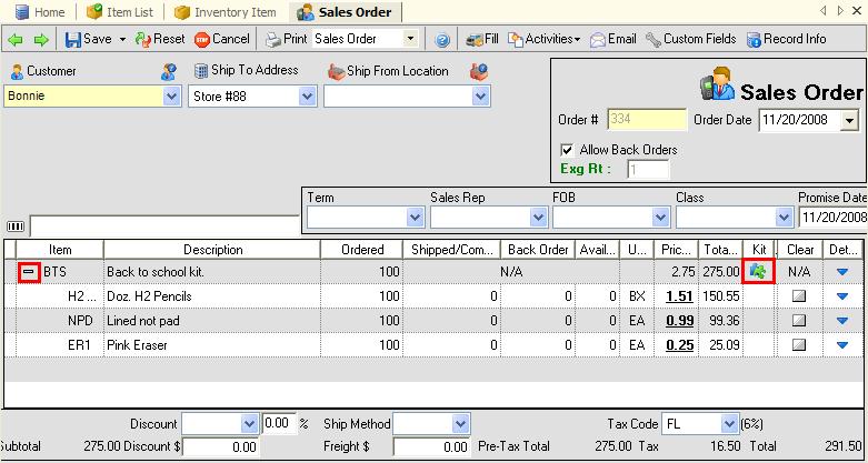 I can now scroll through all the components and pick my options by checking the appropriate item. I can also change the Qty Per, Item price on a per item basis or change the kit qty and price per for the kit as a whole. As a result the Total will change to reflect the total price to the customer. (Note: If you are an item that is a configuration instead of a kit, the price per will not be displayed as this can be changed directly on the sales order). After you have completed your edits, press 'OK'. The kit along with all of the selected components will be shown on the sales order (Note: If you are an item that is a configuration instead of a kit, only the non-configured items will be displayed). You can collapse the kit items under the kit by CHECKING 'Allow collapsing/expanding on kit lines' in Sales Order Preferences.