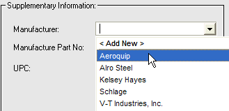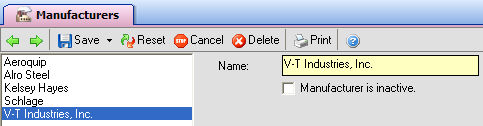 To add a new Manufacturer to this list, simply choose Save & New from the Manufacturers tab's Save button. If you wish to temporarily remove a manufacturer from the Inventory Item drop-down list without deleting it entirely, check the Manufacturer is inactive box.