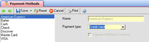 To add a new payment method, choose Save & New from the tab's Save tool. Then simply enter a name, and choose either Credit Card or Cash or Check from the Payment type drop-down list.