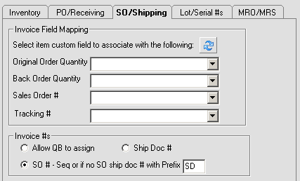 The SO/Shipping tab sports four drop-down lists. With them, you can associate an appropriate QuickBooks custom field to each of three All Orders fields that do not have a default QB counterpart. That way, when creating a sales order within QB, you can make sure these elements make it into your All Orders sync. Click the refresh button above the drop downs to load them with the latest available fields from Quickbooks. The Original Order Quantity as well as the Back Order Quantity fields can be mapped to custom item fields within QuickBooks, whereas the Sales Order # and Tracking # can be mapped to a custom customer field.