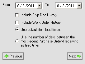 Use Default Lead Times/Use Calculated Lead Times: Select Use default lead times if you want to simply use the lead times that are currently assigned to your items. If you would like to use calculated lead time based on the most recent, actual lead time, select Use the number of days between the most recent Purchase Order/Receiving as lead times.