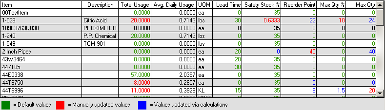 Click Next to load all of the data and start generating new reorder points, lead times and max quantities. Notice the data in the list may have different colors associated with them. Default values are colored green. When all the data is loaded for the first time everything will be in green. If a value is manually edited by the user it turns red. If another value is recalculated due to another value being edited manually, it will turn blue.