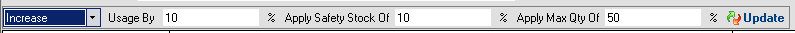 Safety Stock %: If you want an additional percentage of the total quantity that is expected to be used to be added to the new reorder point you can enter it here. For example if you have an average daily usage for an item of 5 and a lead time of 5 days the reorder point would be 25. If you want an additional 20% in stock on top of what is expected to be used up, enter 20 into the Safety Stock % and it will increase the reorder point to 30.