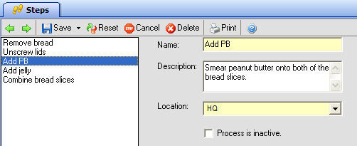 To create a new step, just click Save & New from the tab's Save tool. Then add a name as well as a complete description. Finally, specify from your various business Locations exactly where this step can take place. As always, if you want to keep a step in the database, but don't want it showing up in the Name drop-down list on your Work Orders, then check Process is inactive.
