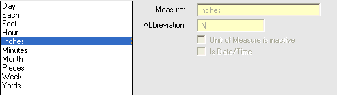 Though it's possible you'll never to add any other UOMs to this list, you can still do so by choosing Save & New from the tab's Save tool. Simply enter a name, an abbreviation, and specify whether the current unit is active or not.